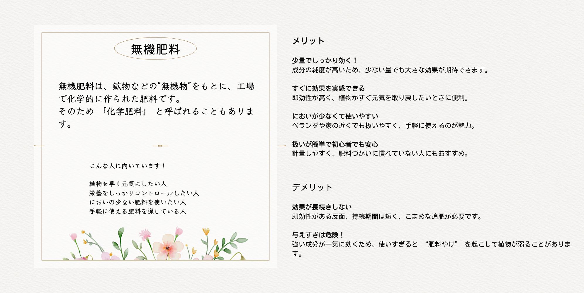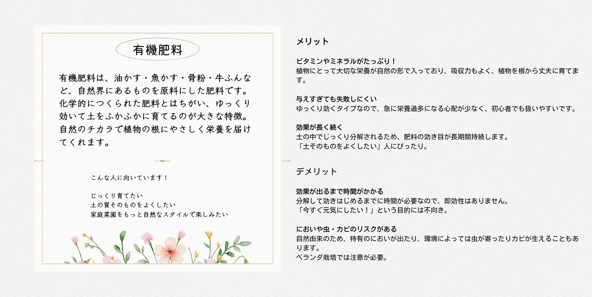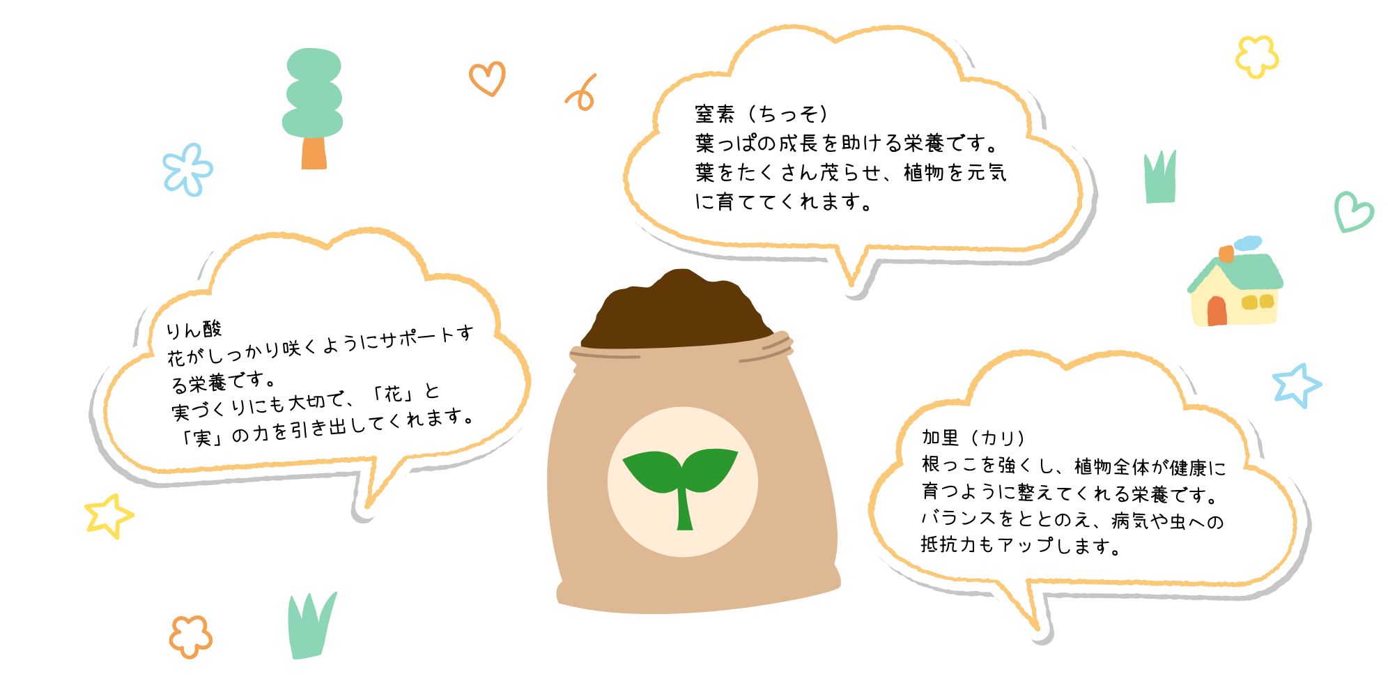 肥料について 肥料 主な肥料成分と役割 有機肥料と無機肥料 おすすめ有機肥料はこちら おすすめ無機肥料はこちら 育てるために必要なもの、基礎知識を学ぼう!に戻る いろんな植物を育ててみよう! よくあるQ&A 各種SNSにて情報発信中!