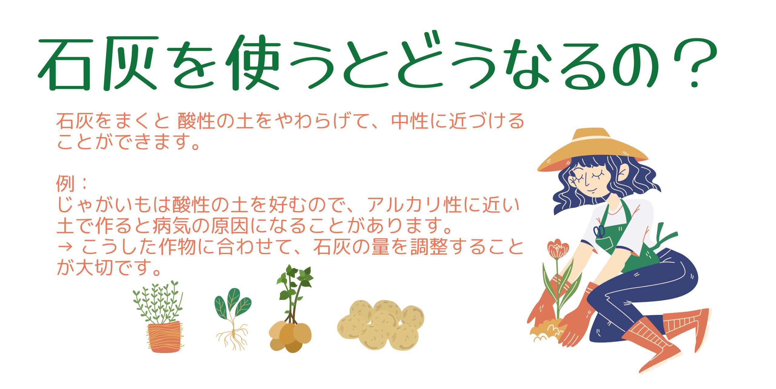 石灰は、酸性に傾いた土を中和して“ちょうど良い状態”にするための材料です。 雨が多い日本では、土が酸性になりやすいため、作物を育てる前に石灰をまくことがよくあります。