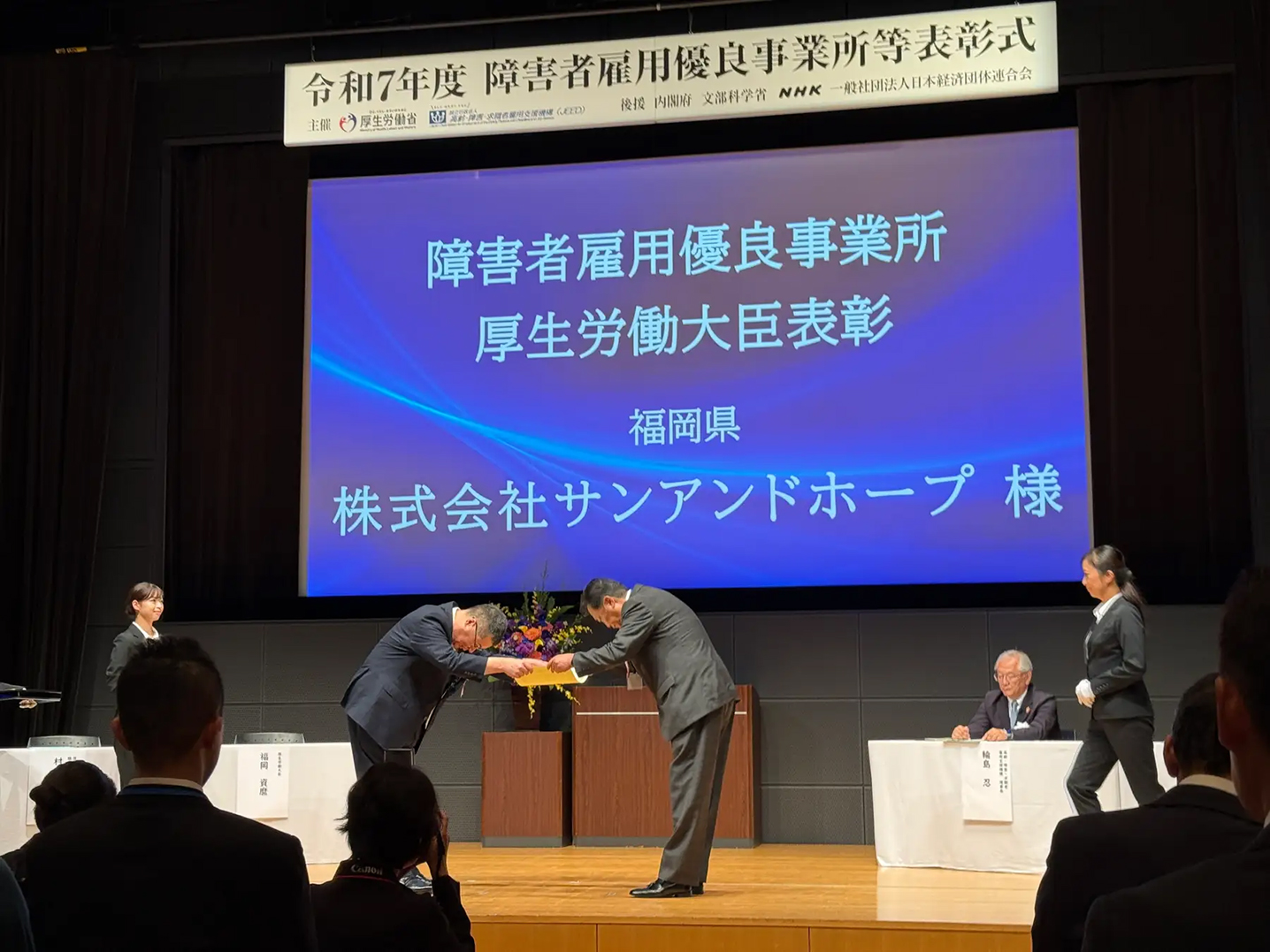 株式会社サンアンドホープ(本社:福岡県北九州市門司区/代表取締役社長 中武英一)は、令和7年度「障害者雇用優良事業所等 厚生労働大臣表彰」を受賞いたしました。