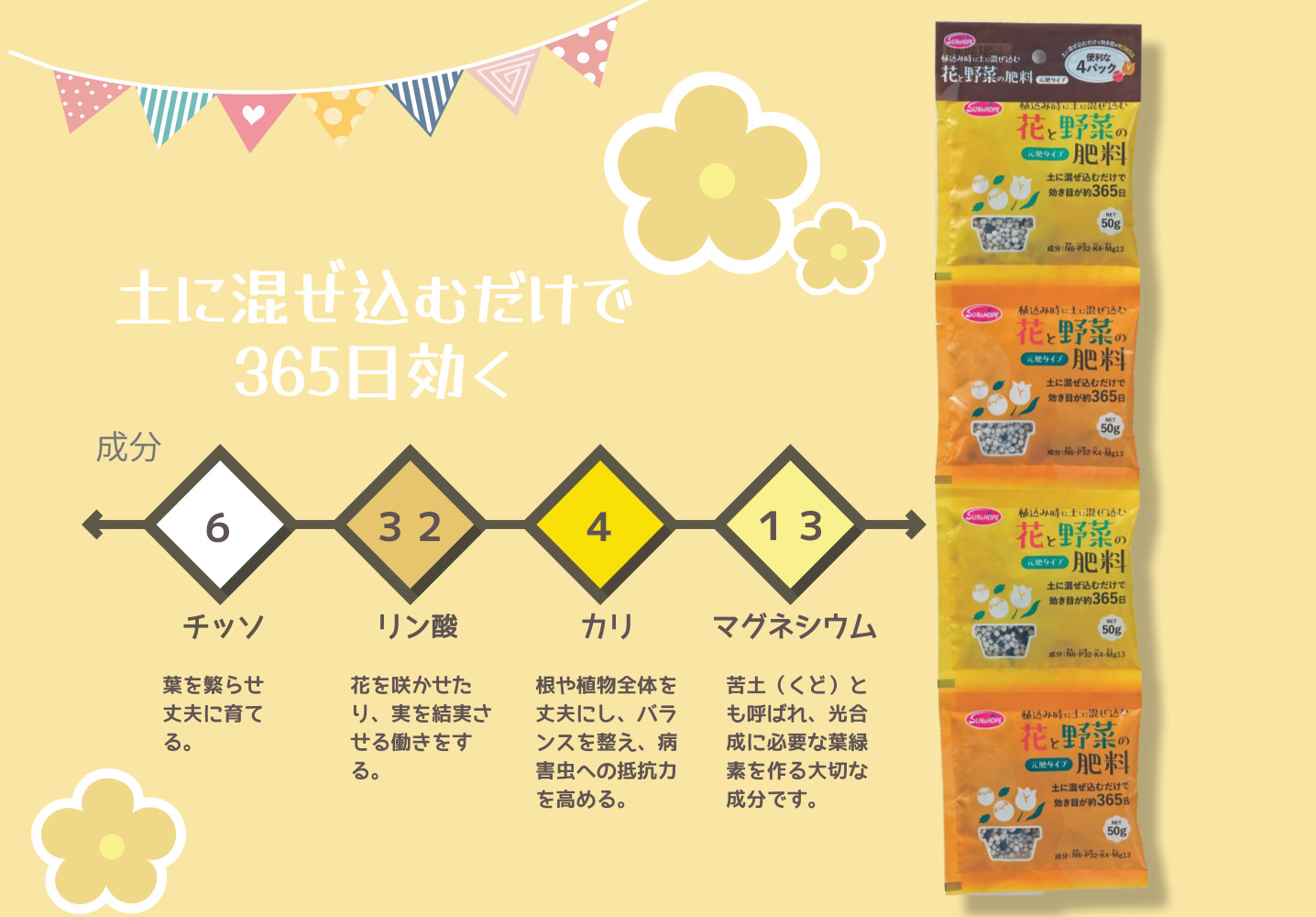一度の施肥でしっかり栄養を届け、花の色・つや・咲き具合を安定して引き出します。