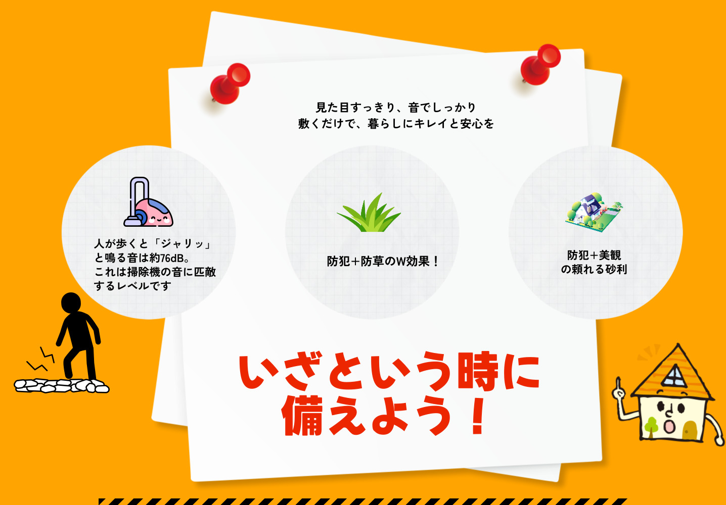 歩くと鳴る独特の音が侵入者をドキッとさせ、防犯効果を発揮します。